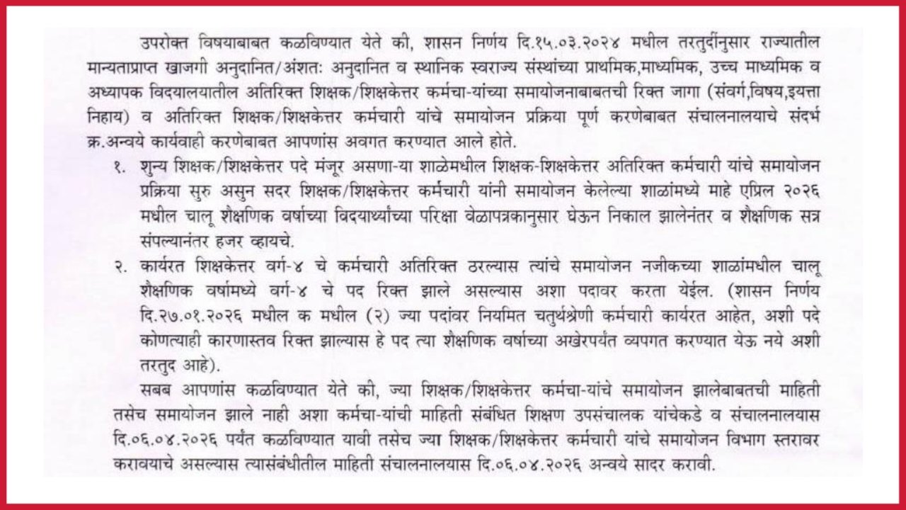 Marathisanhita चंदना पवार प्रतिनिधी [ Important Circular Issued Regarding the Adjustment of Teaching and Non-Teaching Staff — Dated 06.04.2026 ] : शिक्षक / शिक्षकेत्तर कर्मचारी समायोजन संदर्भात शिक्षण संचालनालय मार्फत दि.06.04.2026 रोजी महत्वपुर्ण परिपत्रक निर्गमित करण्यात आलेला आहे . सदर परिपत्रकानुसार नमुद करण्यात आले आहेत कि , शासन निर्णय दिनांक 15.03.2026 मधील तरतुदींनुसार राज्यातील मान्यताप्राप्त … Read more