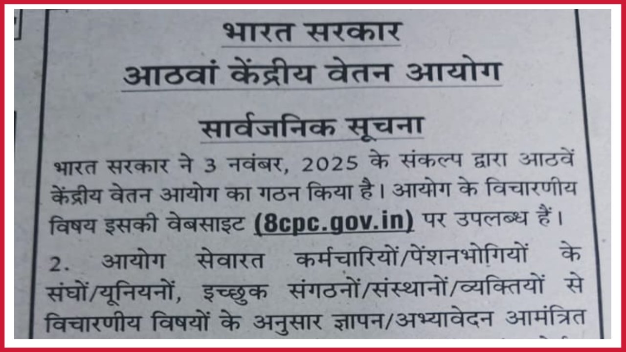 सदर जाहीर करण्यात आलेल्या सुचना मध्ये नमुद करण्यात आले आहेत कि , भारत सरकारने दिनांक 03.11.2025 च्या संकल्पद्वारे आठवा वेतन आयोगाचे गठण केले आहे . आयोग संदर्भात इतर आवश्यक माहिती 8cps.gov.in या संकेतस्थळावर माहिती उपलब्ध करुन देण्यात आलेली आहे .