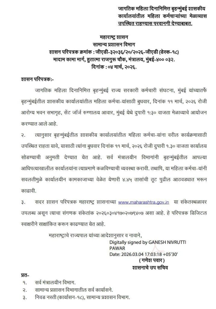 Marathisanhita खुशी पवार प्रतिनिधी [ Government Resolution (GR) regarding declaring holiday on March 11 only for women employees issued on 04.03.2026 ] : दि.11 मार्च रोजी महिला कर्मचाऱ्यांना सुट्टी जाहीर करणेबाबत सामान्य प्रशासन विभाग मार्फत दि.04 मार्च 2026 रोजी शासन निर्णय निर्गमित करण्यात आलेला आहे .