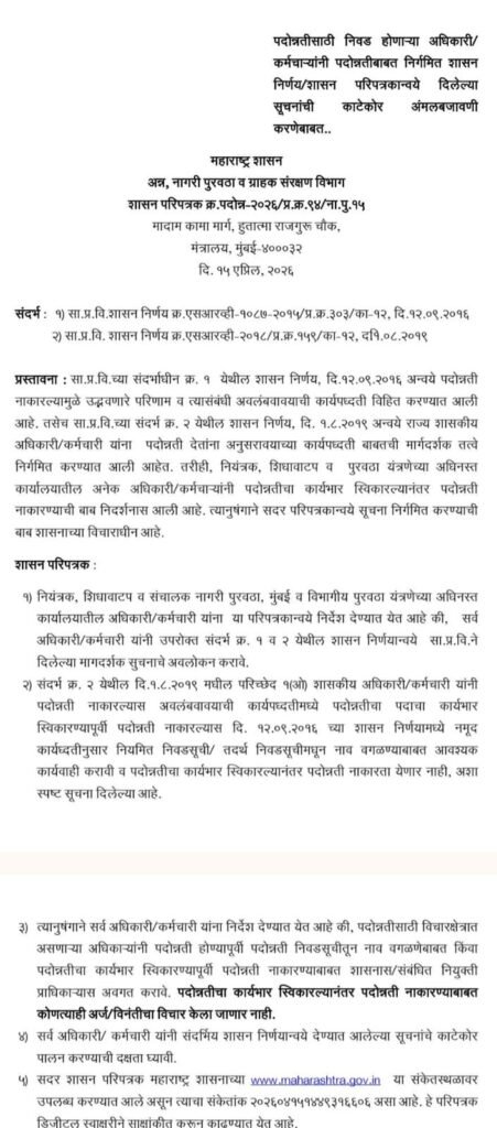 Marathisanhita चंदना पवार प्रतिनिधी [ Government Resolution issued on 15.04.2026 regarding the strict implementation of instructions concerning promotions. ] : पदोन्नती संदर्भात सुचनांची काटेकोर अंमलबजावणी करणेबाबत अन्न , नागरी पुरवठा व ग्राहक संरक्षण विभाग मार्फत दि.15.04.2026 रोजी महत्वपुर्ण शासन निर्णय निर्गमित करण्यात आलेला आहे .