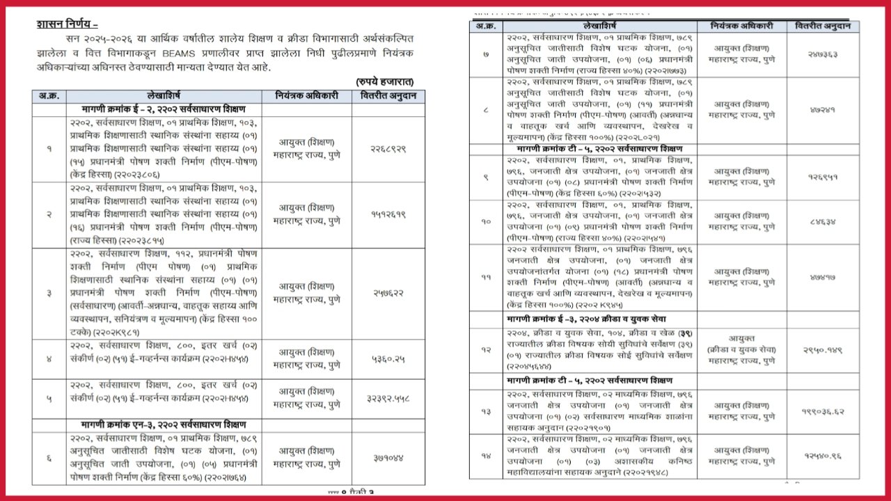 यानुसार सन 2025-26 या आर्थिक वर्षातील शालेय शिक्षण व क्रिडा विभाग करीता अर्थसंकल्पित झालेला व वित्त विभाग मार्फत बीम्स प्रणालीवर प्राप्त झालेला निधी पुढील नियंत्रक अधिकाऱ्यांच्या अधिनस्त ठेवण्याकरीता मान्यता देण्यात येत आहे .