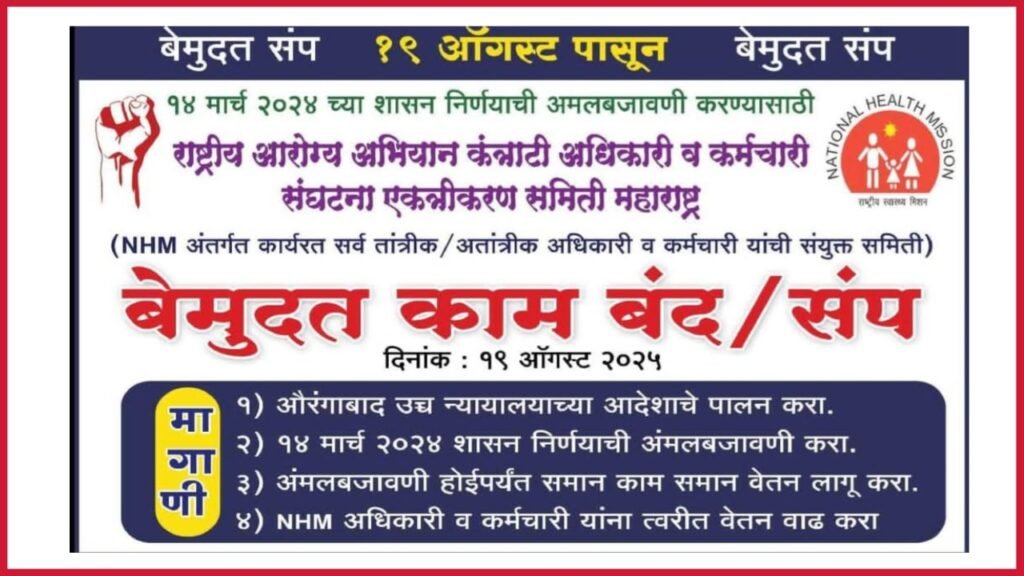 Marathisanhita चंदना पवार प्रतिनिधी [ Indefinite work stoppage/strike of these state officers/employees across the state from 19.08.2025 ] : दिनांक 19 ऑगस्ट 2025 पासुन एनएचएमचे कर्मचाऱ्यारी बेमुदत संपावर गेले आहेत