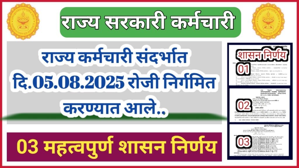 Marathisanhita चंदना पवार प्रतिनिधी [ 03 important government decisions were issued on 05.08.2025 regarding state employees. ] राज्य कर्मचारी संदर्भात दिनांक 05 ऑगस्ट 2025 रोजी 03 महत्वपुर्ण शासन निर्णय निर्गमित