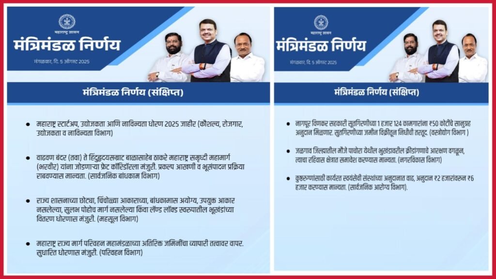 Marathisanhita चंदना पवार प्रतिनिधी [ 03 major/important cabinet decisions were taken in the cabinet meeting held on 05th August. ] : दिनांक 05 ऑगस्ट 2025 रोजी झालेल्या राज्य मंत्रीमंडळ बैठकीत