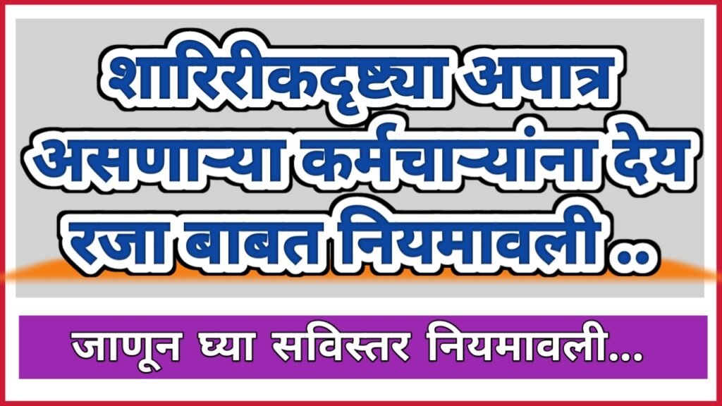 Marathisanhita संगिता पवार प्रतिनिधी [ Regulations regarding leave entitlement for physically unfit employees. ] : शाररिकदृष्ट्या अपात्र असणाऱ्या कर्मचाऱ्यांना देय रजा बाबत नियमावली पुढीलप्रमाणे आहे . एखादा कर्मचारी हा शारिरीक