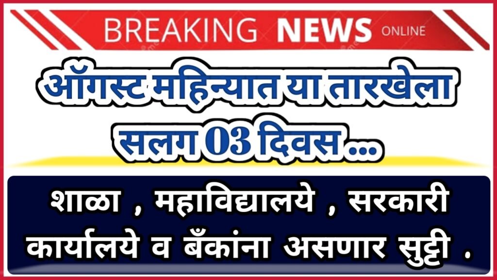 Marathisanhia चंदना पवार प्रतिनिधी [ 03 consecutive days off on this date in August ] : माहे ऑगस्ट महिन्यांत तीन दिवस सलग शाळा , महाविद्यालये , सरकारी कार्यालये तसेच बँकांना
