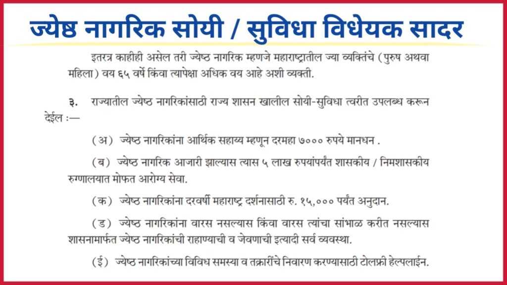 Marathisanhita चंदना पवार प्रतिनिधी [ A bill has been introduced to provide facilities like Rs. 7000/- honorarium per month, free health care, Rs. 15,000/- for Maharashtra Darshan to senior citizens