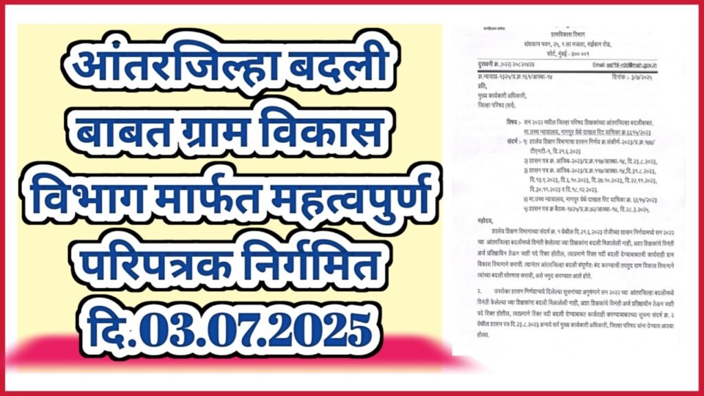 Marathisanhita चंदना पवार प्रतिनिधी [ Important circular issued by Rural Development Department regarding inter-district transfer dated 03.07.2025 ] : राज्यातील शिक्षक संवर्गातील आंतरजिल्हा बदली बाबत ग्राम विकास विभाग मार्फत दिनांक