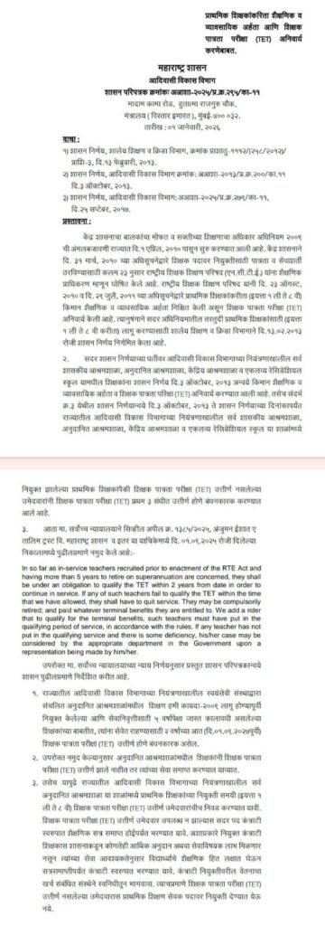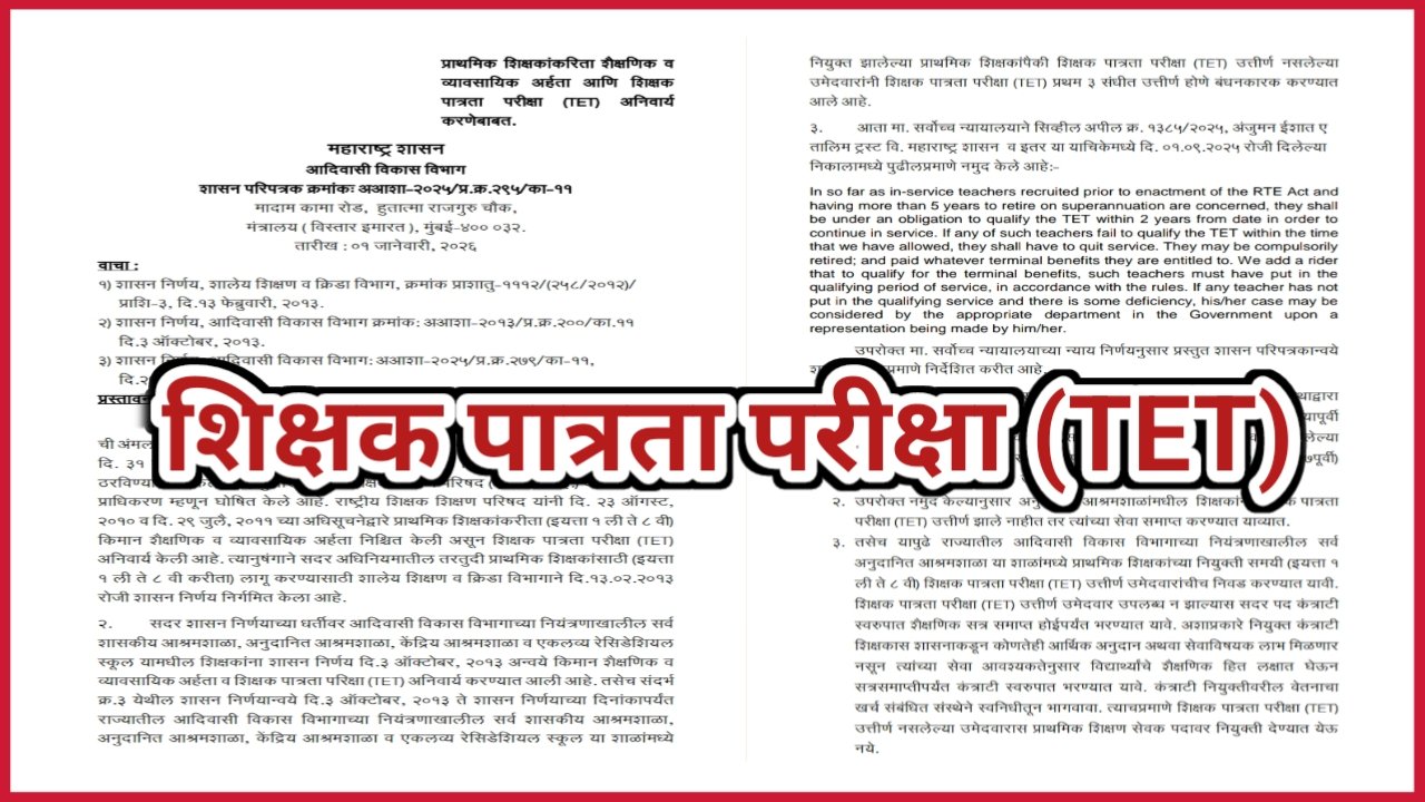 TET अनिवार्यता संदर्भात महत्वपुर्ण शासन निर्णय निर्गमित दि.01.01.2026