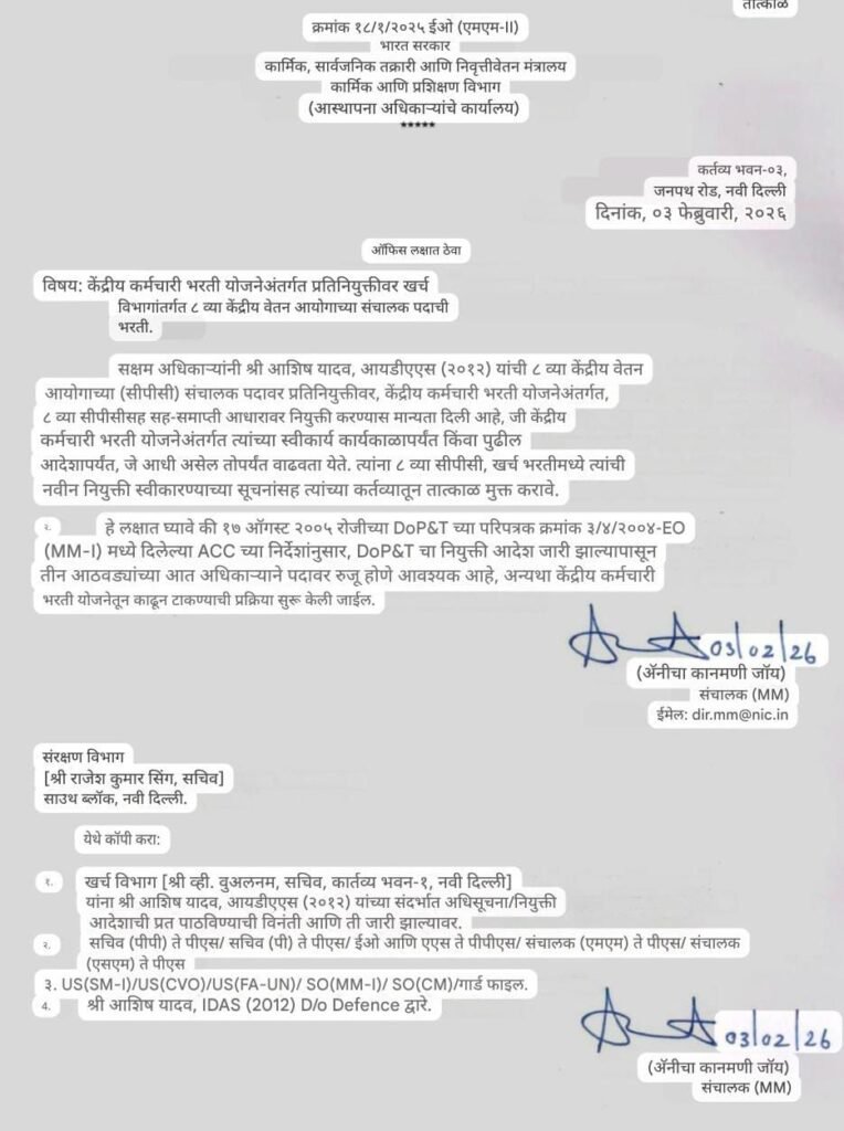 यांमध्ये नमुद करण्यात आले आहेत कि , सक्षम अधिकाऱ्यांनी श्री आशिष यादव यांची आठव्या केंद्रीय वेतन आयोगाच्या संचालक पदावर प्रतिनियुक्तीवर केंद्रीय कर्मचारी भरती योजना अंतर्गत आठव्या सीपीसीसह सह – समाप्ती आधारावर नियुक्ती करण्यास मान्यता दिली आहे .