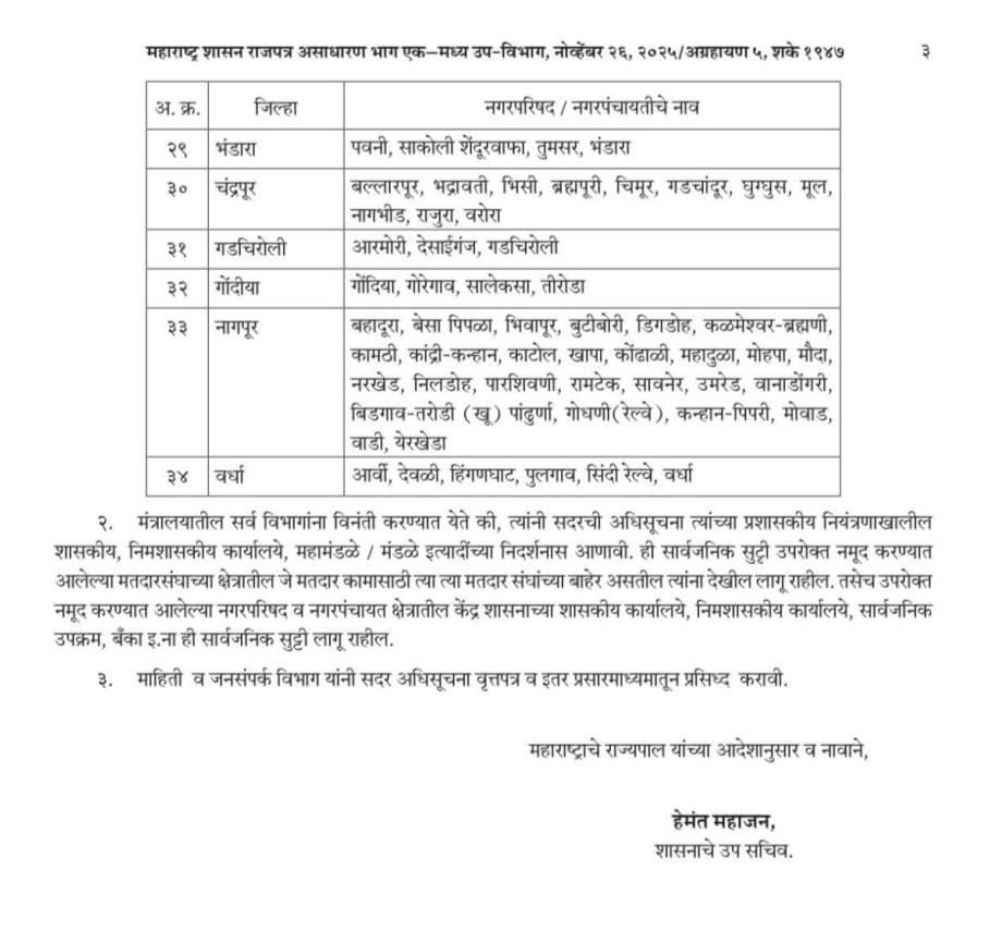 मंगळवार दि.02.12.2025 रोजी राज्यातील स्थानिक स्वराज्य संस्था ( नगर पंचायती / नगर परिषदा ) संस्थेच्या मतदार संघात सार्वजनिक सुट्टी जाहीर करण्यास मंजुरी देण्यात आली आहे .