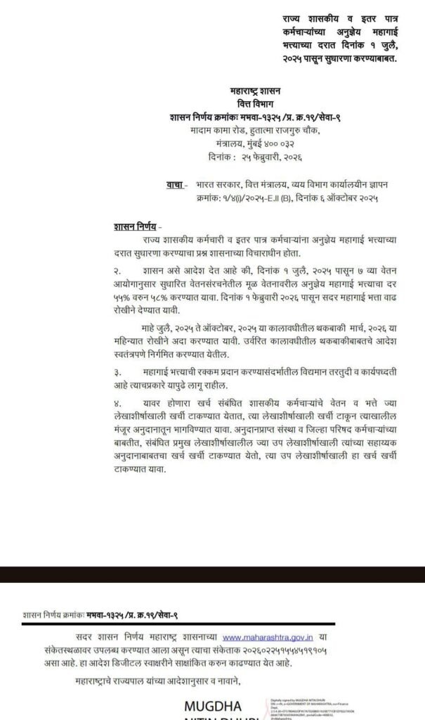 अखेर आज दिनांक 25 फेब्रुवारी 2026 रोजी वित्त विभाग मार्फत शासन निर्णय ( Gr ) निर्गमित करण्यात आलेला आहे . सदर शासन निर्णयानुसार राज्यातील सर्वच कर्मचाऱ्यांना महागाई भत्ता वाढ लागू करण्यात आलेला आहे .