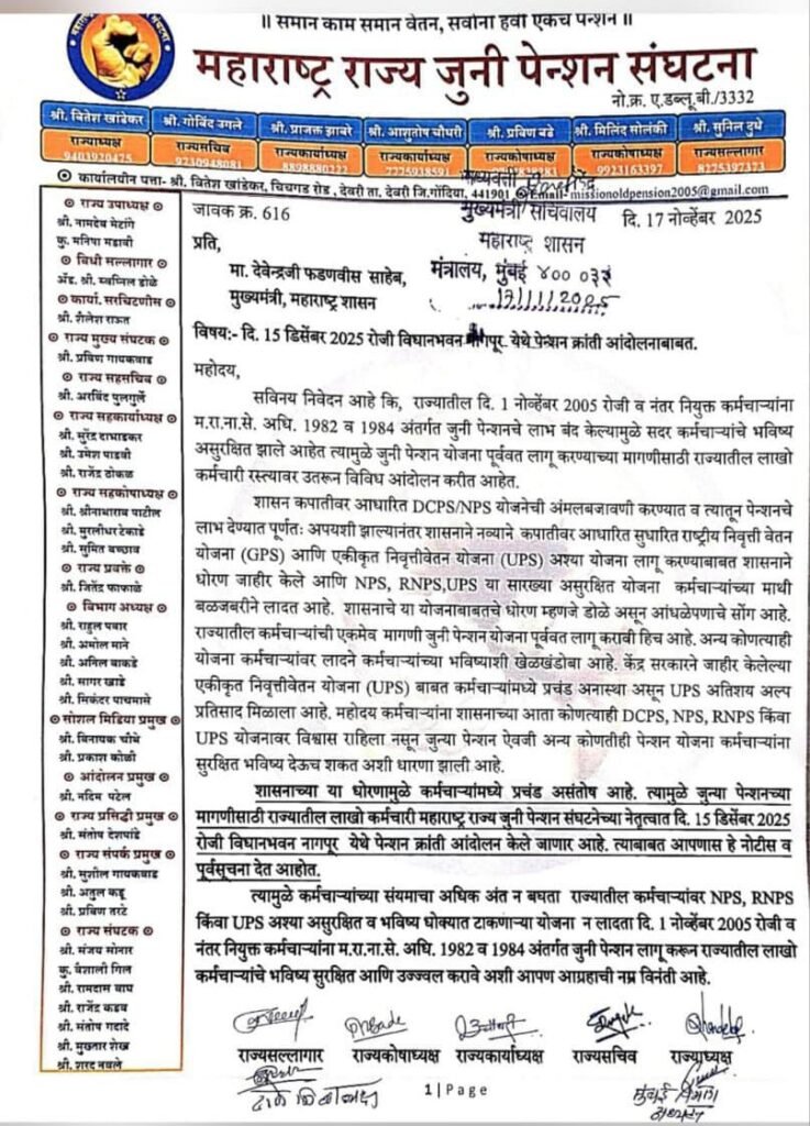 महाराष्ट्र राज्य जुनी पेन्शन संघटना मार्फत दिनांक 15 डिसेंबर 2025 रोजी विधानभवन नागपुर येथे पेन्शन क्रांती आंदोलन आयोजित करण्यात आले आहेत . याबाबत राज्याचे मा.मुख्यमंत्री यांना निवेदन पत्र सादर करण्यात आले आहेत .