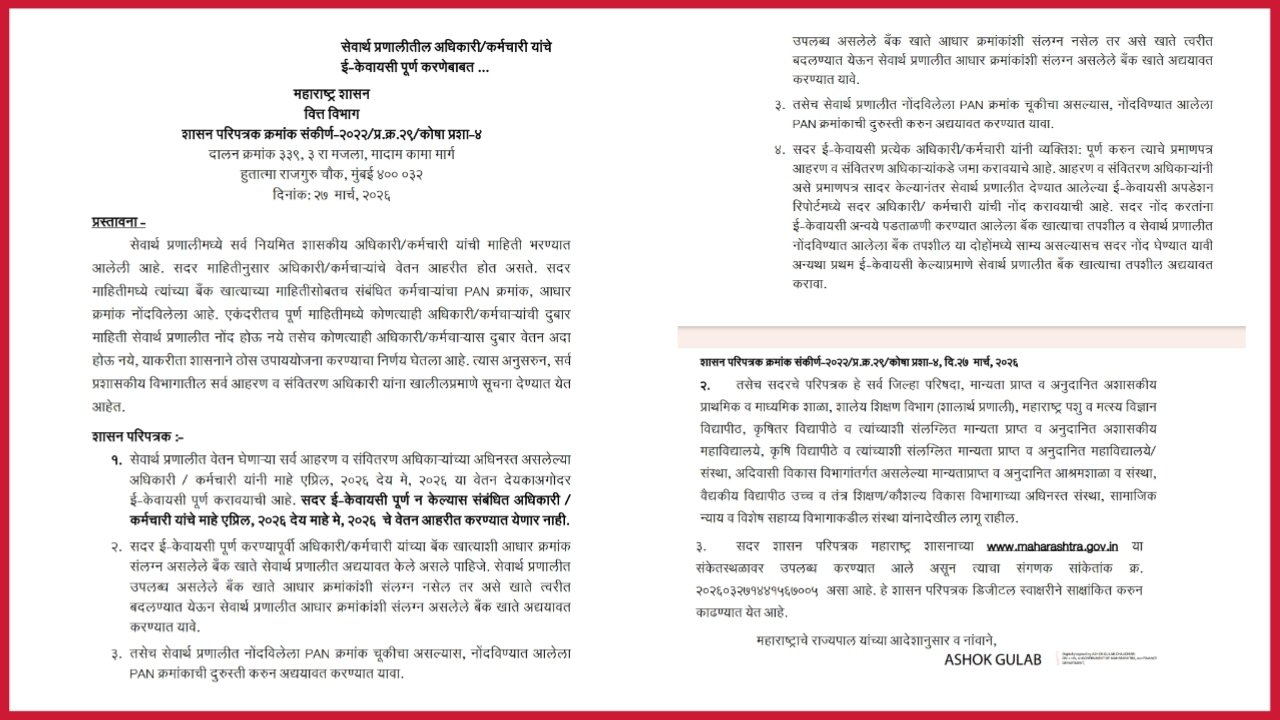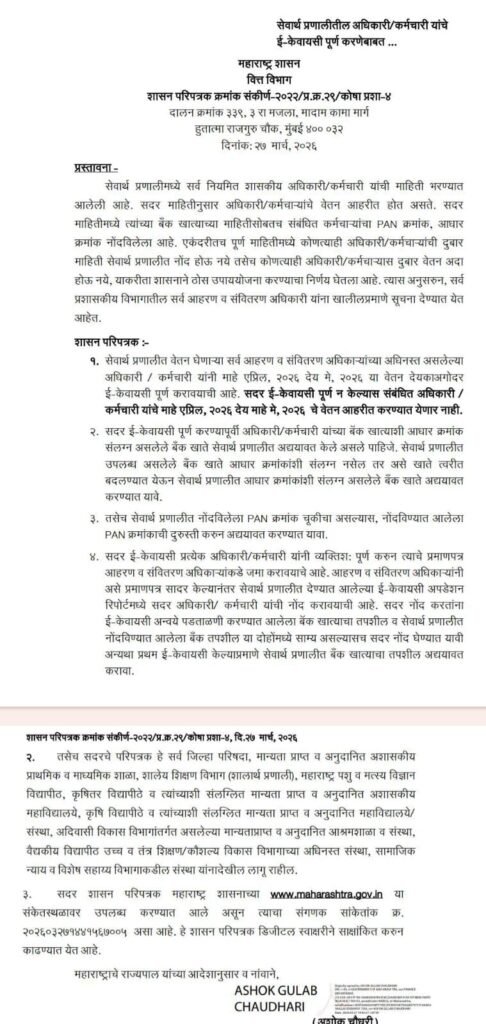 Marathisanhita चंदना पवार प्रतिनिधी [ State officials and employees will not receive their salaries for the month of April until this task is completed. ] : माहे एप्रिल महिन्याचे वेतन अदा करणे संदर्भात वित्त विभाग मार्फत दि.27.03.2026 रोजी महत्वपुर्ण परिपत्रक निर्गमित करण्यात आलेला आहे .