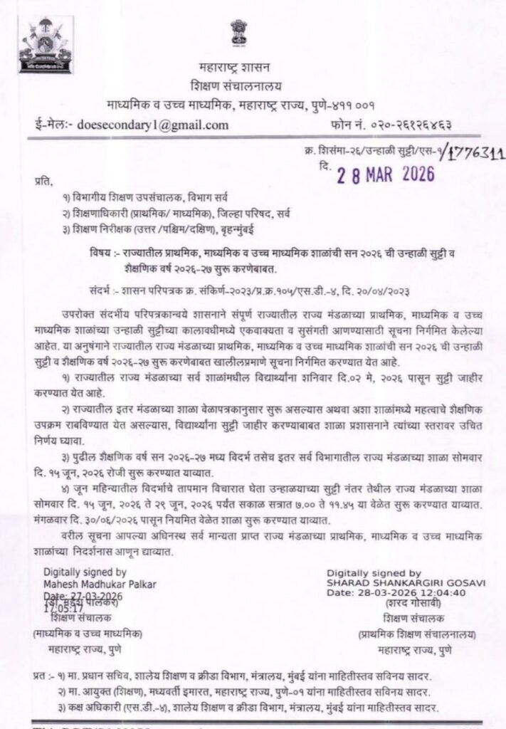 - राज्यातील शाळांना या दिवशी पासुन उन्हाळी सुट्टी जाहीर ; परिपत्रक निर्गमित दि.28.03.2026