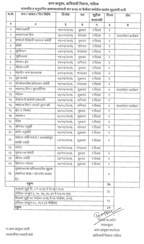 वरीलप्रमाणे सार्वजनिक सुट्टी 25 दिवस , उन्हाळी सुट्टी 38 दिवस व दिवाळी सुट्टी 18 दिवस असे एकुण 81 दिवस शाळांना सुट्टी असणार आहे .