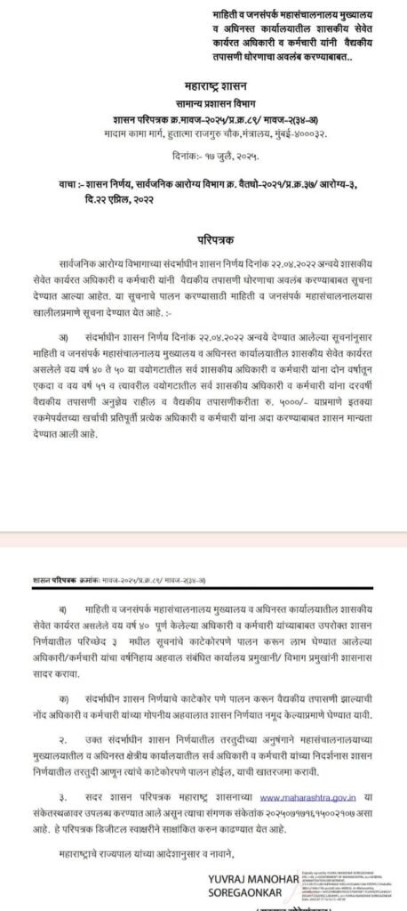 सदर शासन निर्णयानुसार नमुद करण्यात आले आहेत कि , राज्य सरकारी सेवेत कार्यरत असणाऱ्या वय वर्षे 40-50 वर्षे दरम्यानच्या सर्वच सरकारी / अधिकारी कर्मचाऱ्यांना 02 वर्षातुन एकावेळी तर वय वर्षे 51 व त्यापेक्षा अधिक वय असणाऱ्यांना प्रतिवर्षी ..