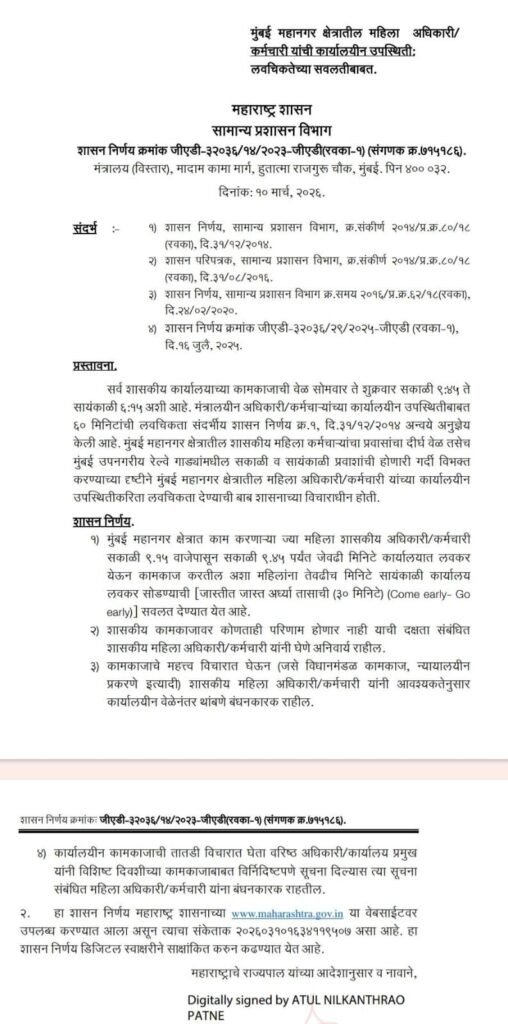 - शासकीय महिला अधिकारी / कर्मचारी कार्यालयात लवकर आल्यास , लवकर कार्यालय सोडण्याची मुभा ; GR निर्गमित दि.10.03.2026